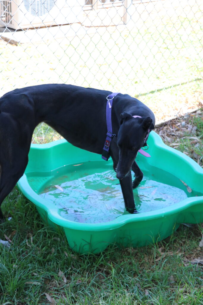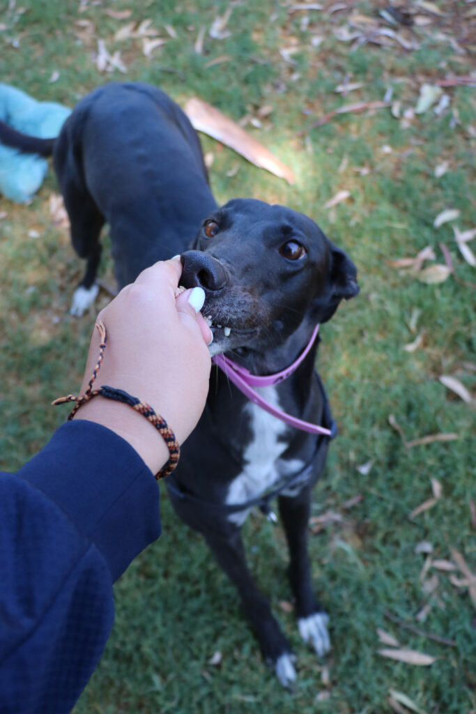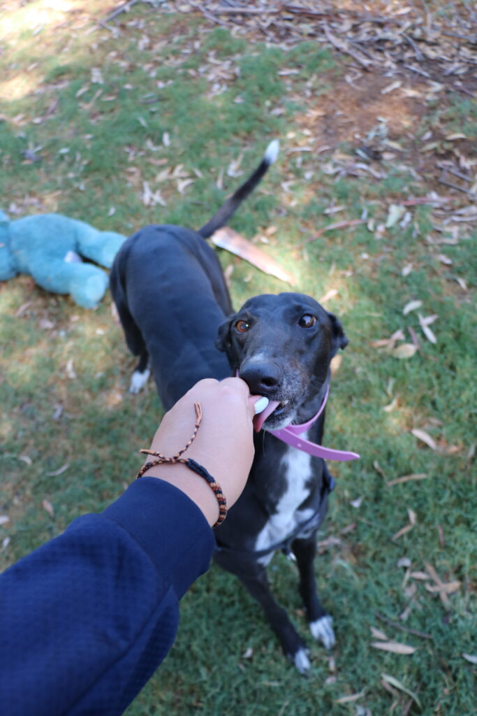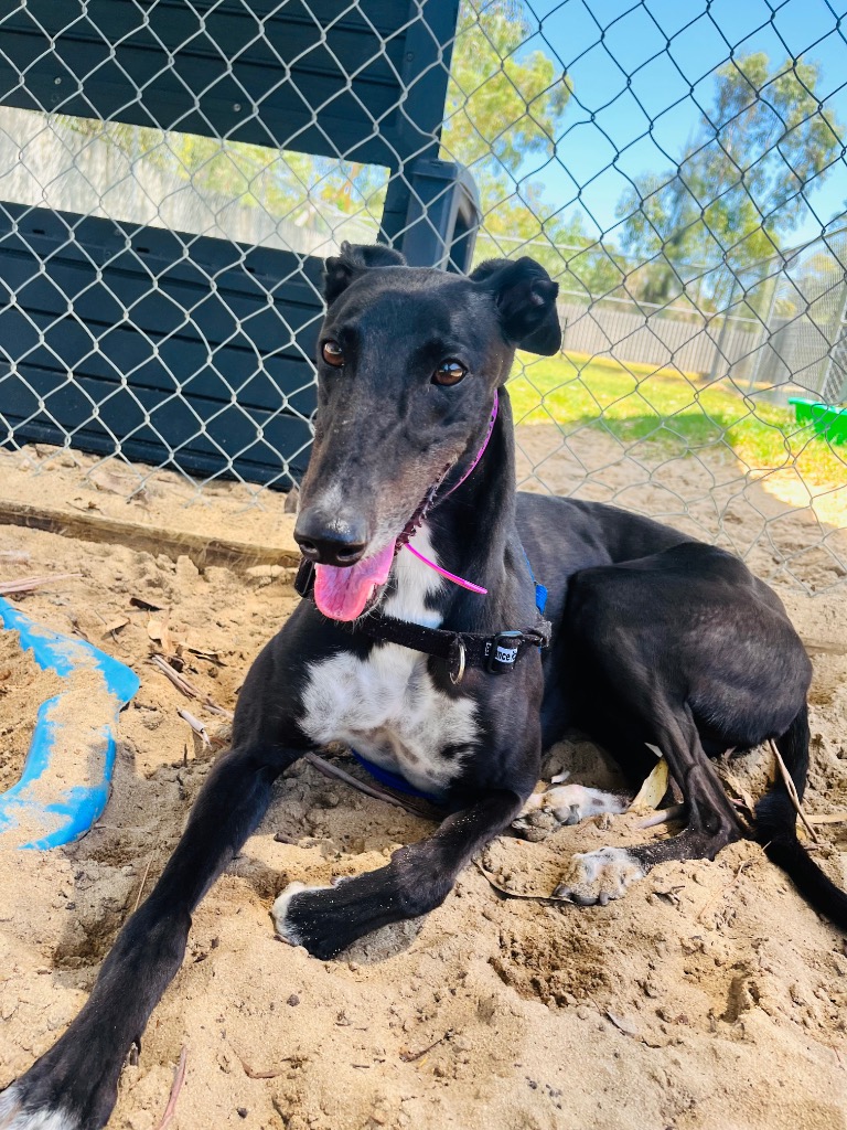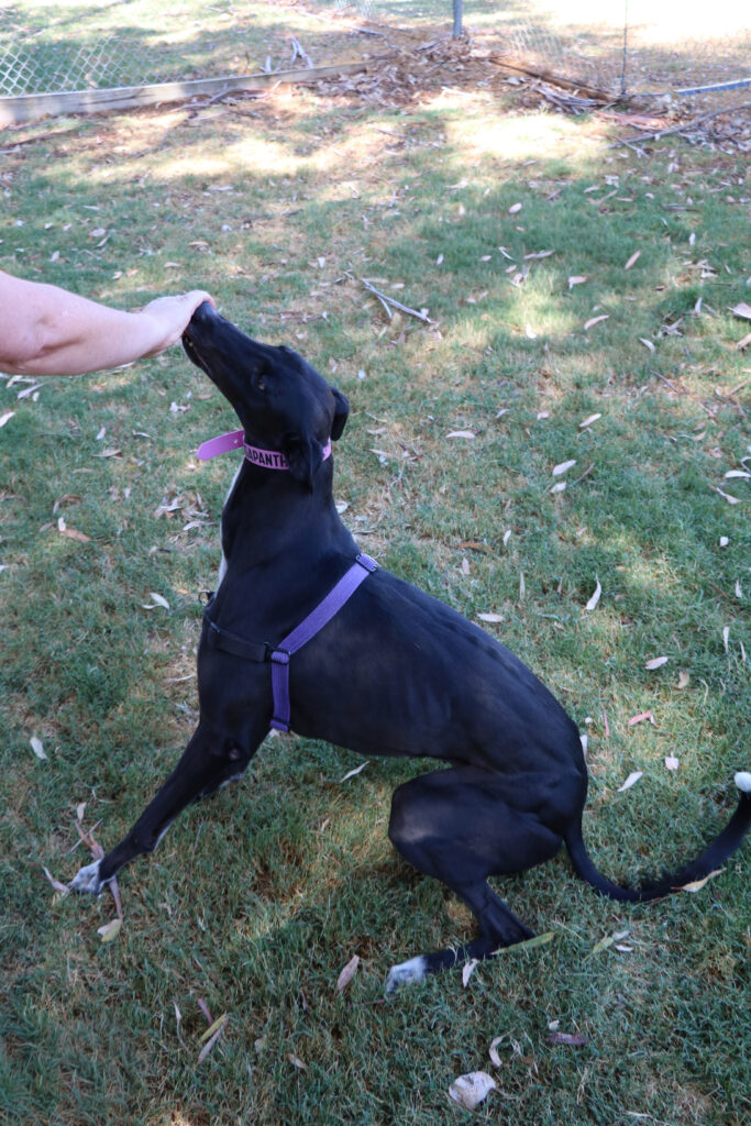 Agapanthus is a sweet, friendly and affectionate little blossom. She has the spirit of a happy bumble bee in a lush garden. Agapanthus could share her garden bed with doggie ‘siblings’ of any size from tiny sprouts to tall trees. Agapanthus has been assessed as unable to go to a home with cats. She’d preferably join a home where all humans are nine years or older, but she could potentially join younger children if they’re sensible and dog savvy. Agapanthus can stay home alone for up to three hours, and with canine company and consistent routine she may be able to stretch that as she settles. Agapanthus is a typical greyhound when it comes to exercise one or two 20‑minute walks will keep her tail wagging like a branch in the wind. She does she love to sniff and take her time on walks investigating gardens, leaves, petals and breezes.