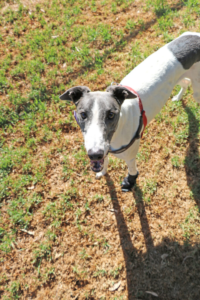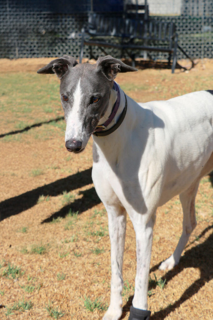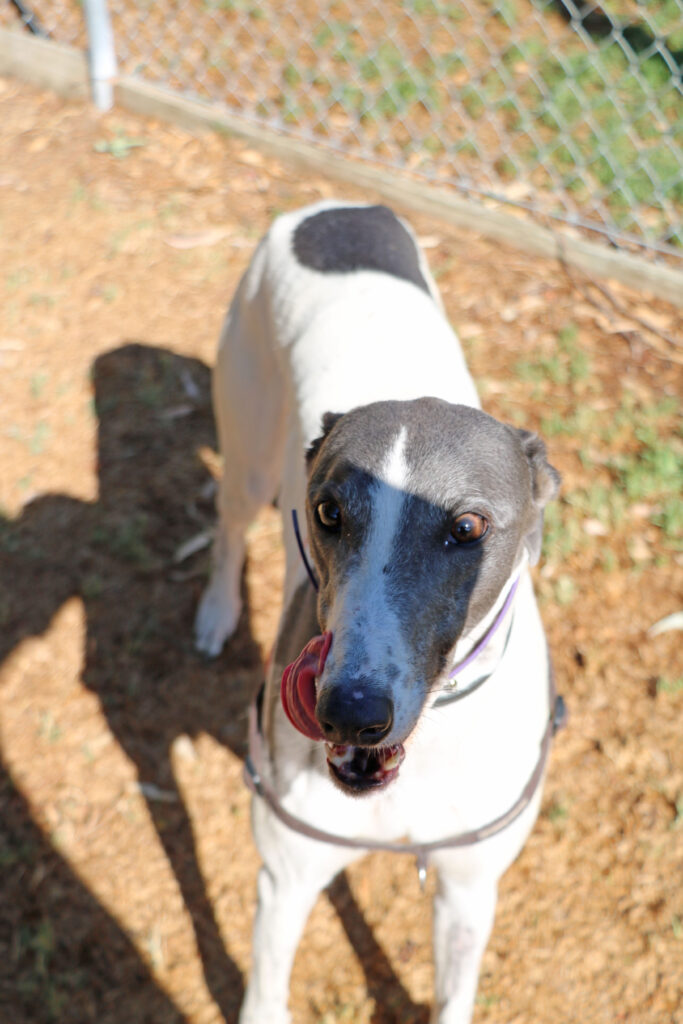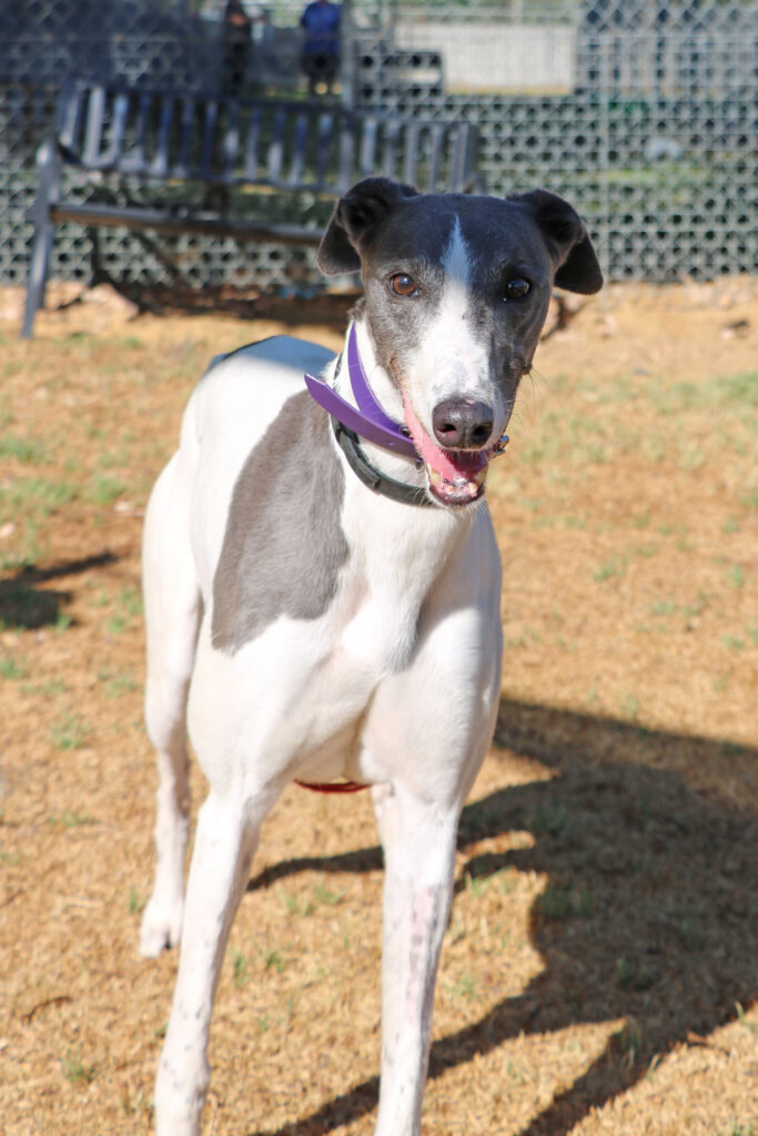 Amity is a calm, easy‑going sweetheart who, true to her name, brings warmth and harmony wherever she goes. This lovely girl could join doggie siblings of any size small to tall. Amity has been assessed as unable to go to a home with cats. Amity is also gentle and well‑mannered enough to live with humans as young as five. Amity is suitable for full‑time workers as she can stay home alone for more than six hours at a time, provided she has a cozy dog bed to curl up in. She’s an expert napper and happy to snooze away the day while waiting for her humans to return. When it comes to exercise Amity is the perfect example of the greyhound style. One or two 20‑minute walks are all she really needs and she has excellent leash manners too, happily trotting beside you.