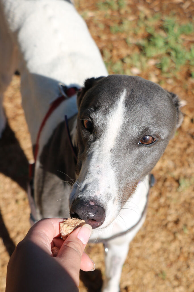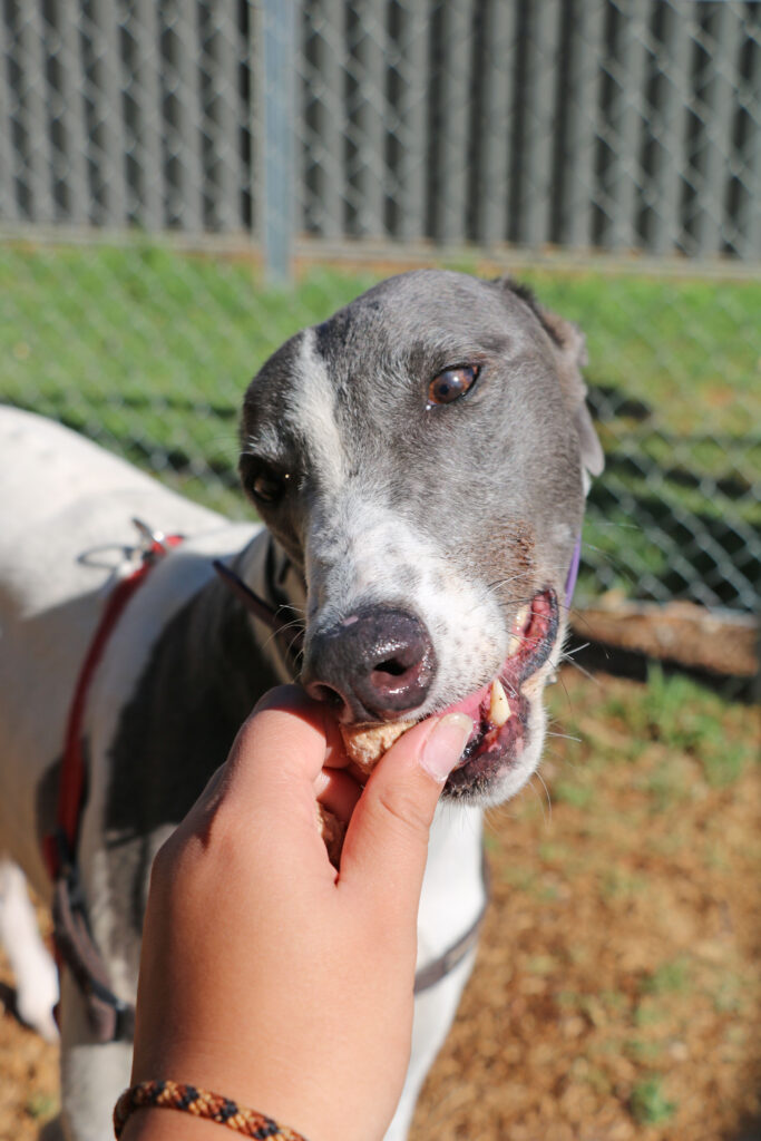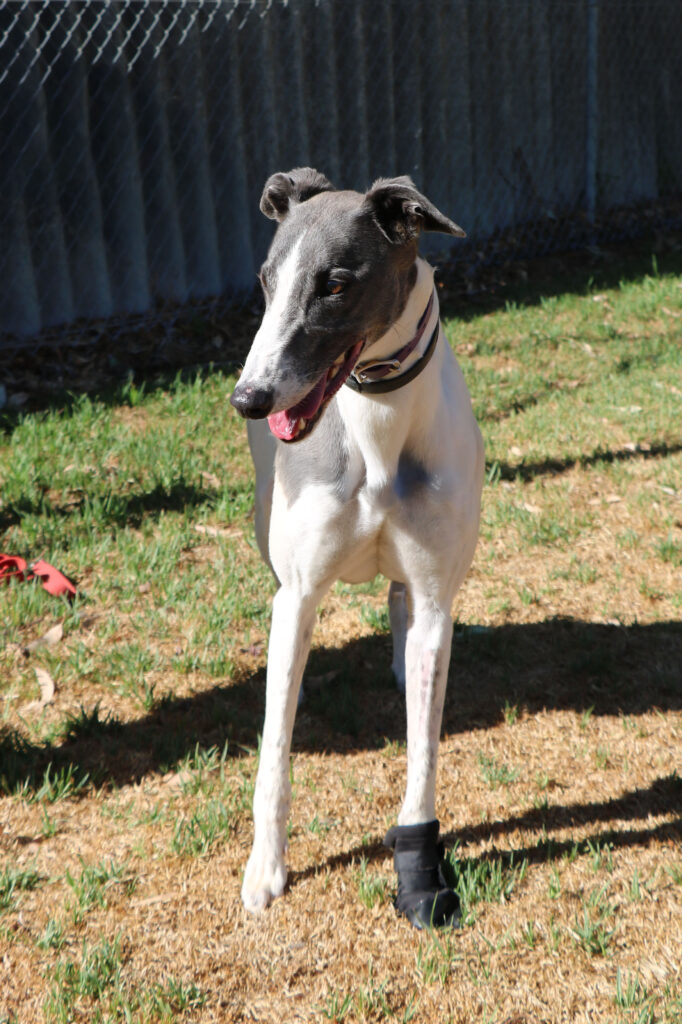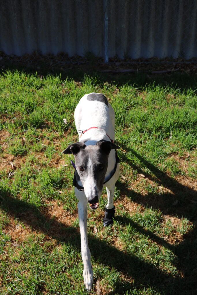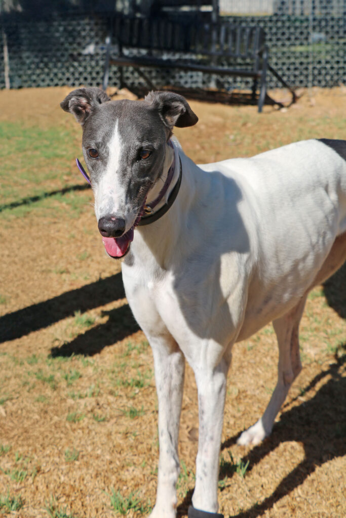 Amity is a calm, easy‑going sweetheart who, true to her name, brings warmth and harmony wherever she goes. This lovely girl could join doggie siblings of any size small to tall. Amity has been assessed as unable to go to a home with cats. Amity is also gentle and well‑mannered enough to live with humans as young as five. Amity is suitable for full‑time workers as she can stay home alone for more than six hours at a time, provided she has a cozy dog bed to curl up in. She’s an expert napper and happy to snooze away the day while waiting for her humans to return. When it comes to exercise Amity is the perfect example of the greyhound style. One or two 20‑minute walks are all she really needs and she has excellent leash manners too, happily trotting beside you.