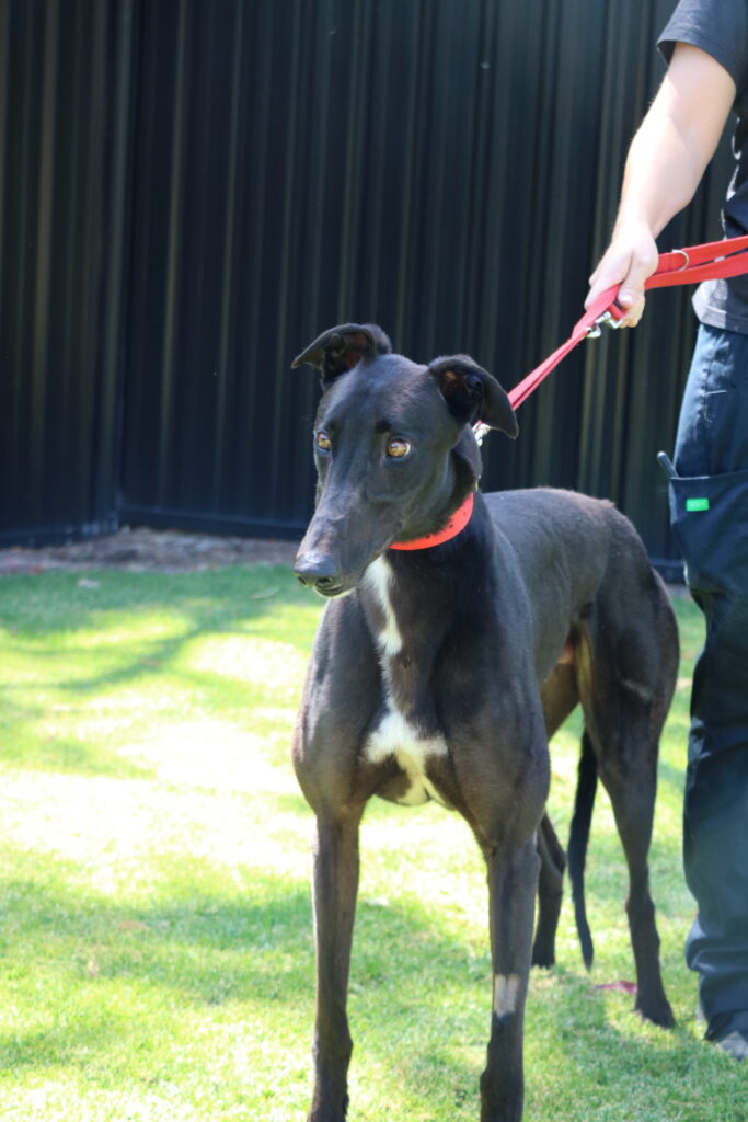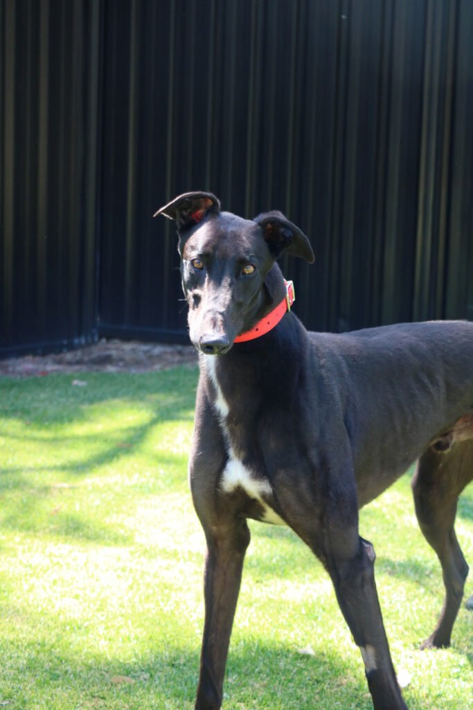 Kewpie is a little comfort dish of a greyhound. He is calm, sweet and gentle with a personality that’s more smooth than spicy. Friendly but a touch shy, he may take a moment to warm up but quickly becomes your favourite flavour. Kewpie would benefit from sharing his kitchen with a medium or large doggie ‘sibling’ who already knows the recipe for pet life and can show Kewpie the ropes of pet life. He’d suit a home where everyone is nine years old or older as he prefers gentle and polite handling. Kewpie has been assessed as unable to go to a home with cats. Kewpie can stay home alone for up to three hours and with canine company and routine that time may increase. His exercise needs are typical greyhound. one or two 20 minute walks a day is plenty to keep him flavourful and tail wagging. Despite his soft and sweet nature, Kewpie’s playful side comes out with toys and he does adorable little pounces!