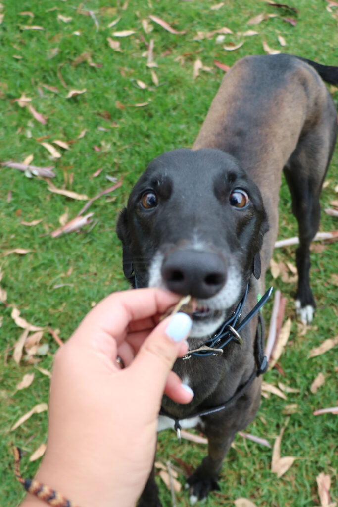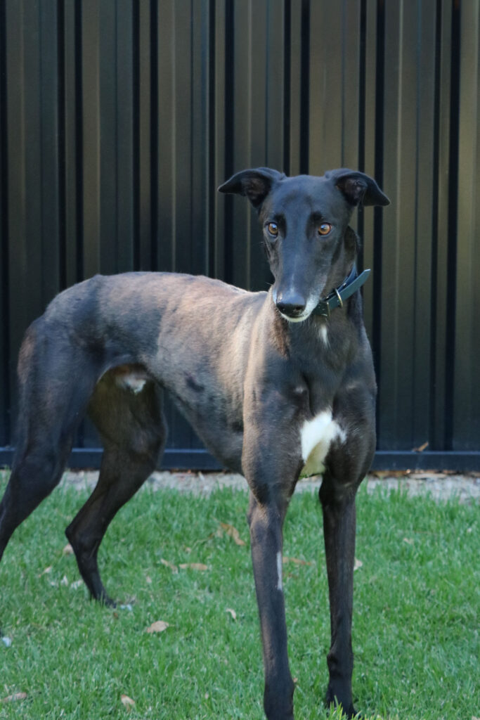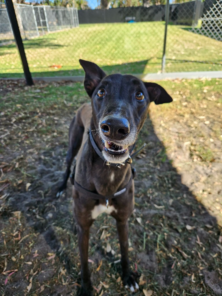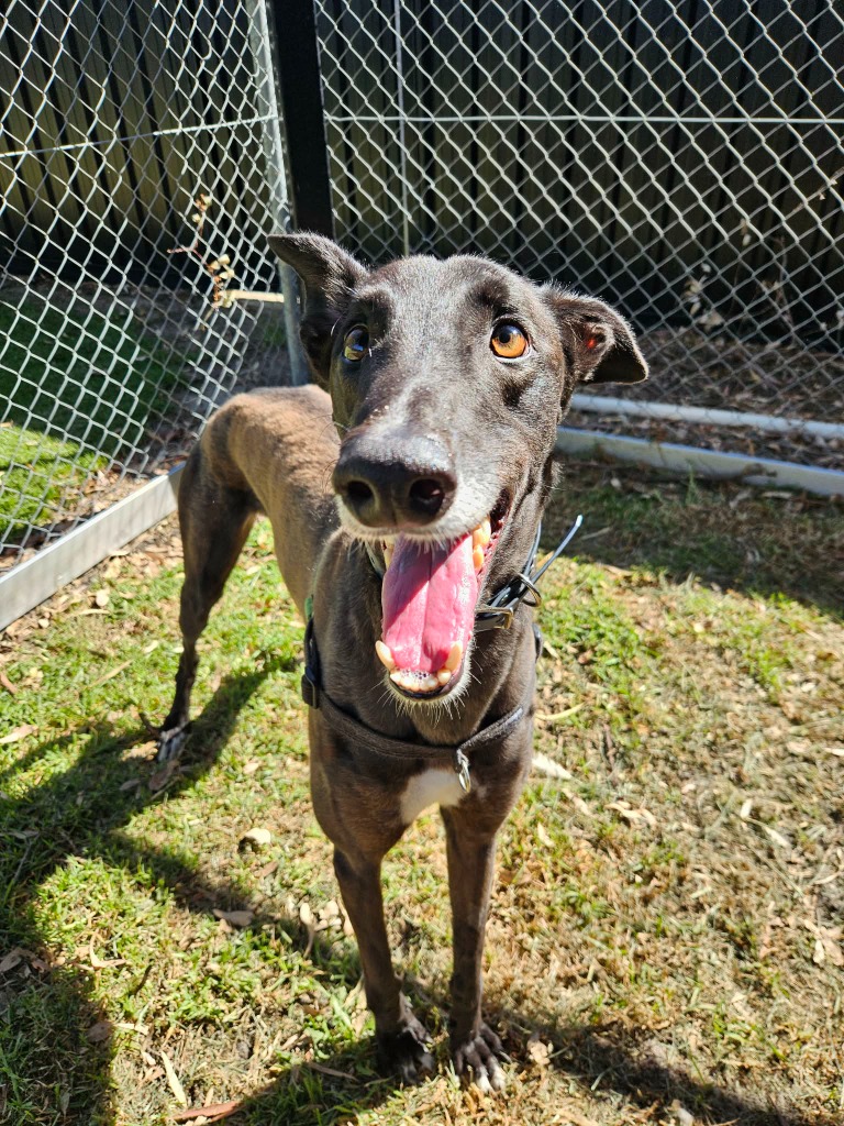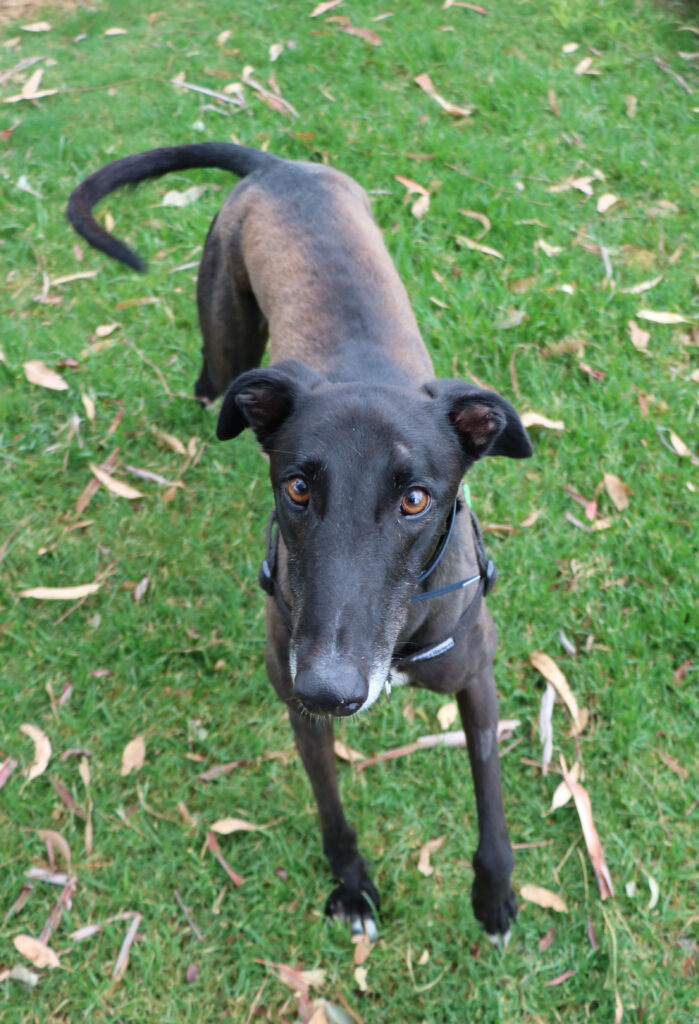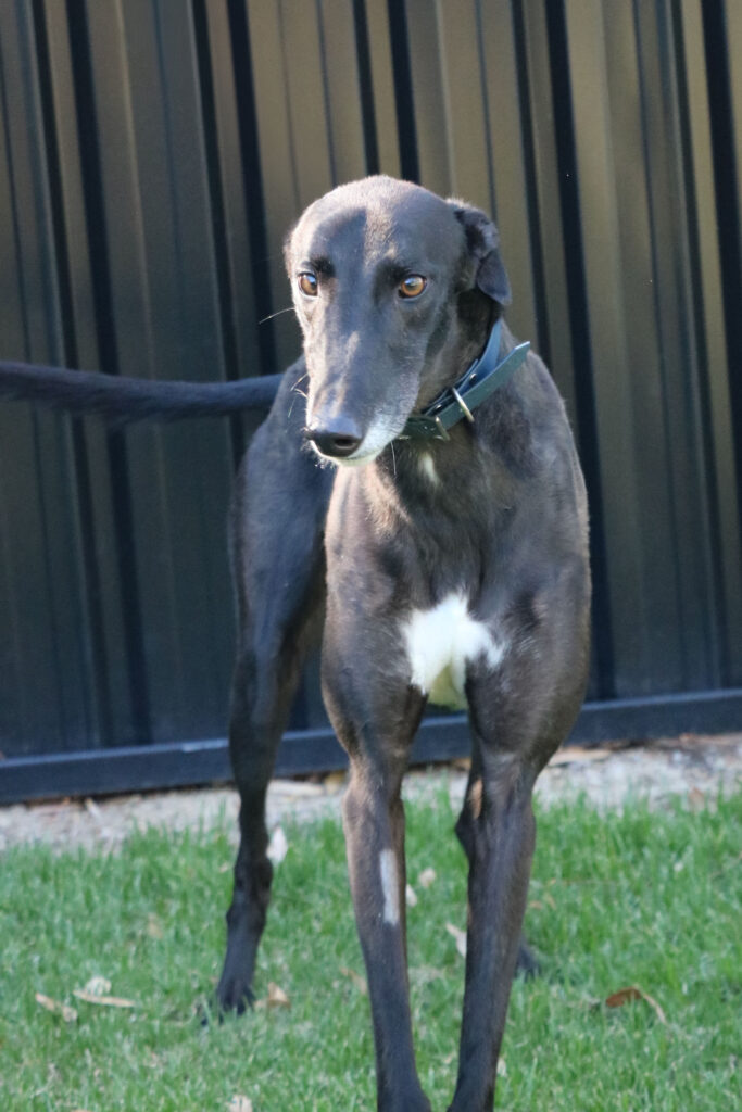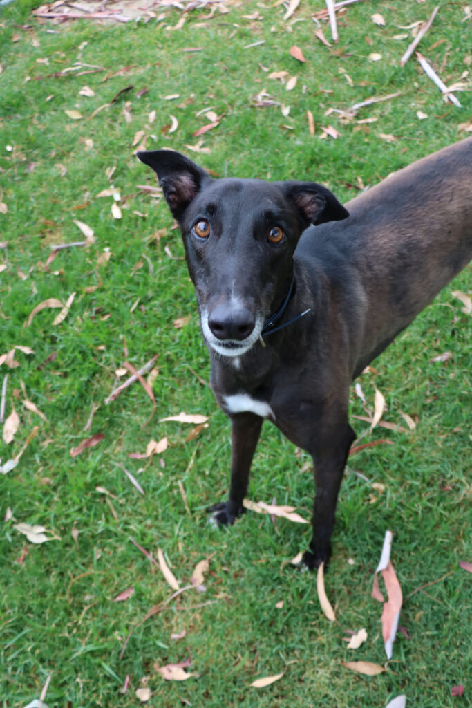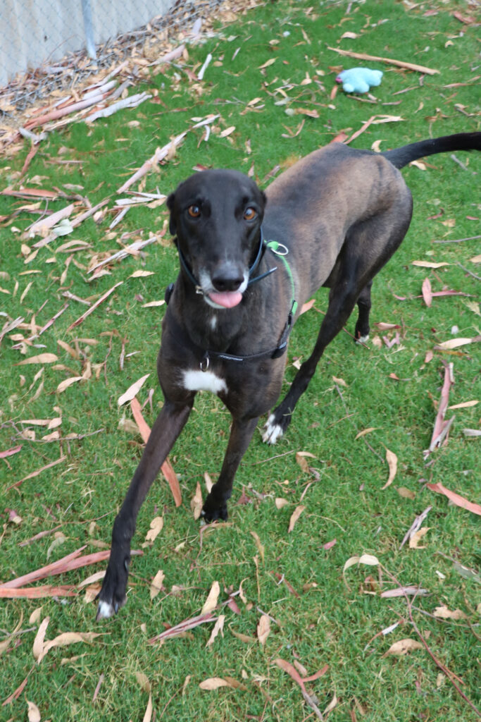 Minnow could share his fishbowl with a large doggie sibling or a fellow greyhound as his long legs and enthusiastic play may overwhelm smaller pups. Minnow has been assessed as unable to go to a home with cats. Minnow would be best suited for a home where all humans are nine years old or older as he would LOVE little guppies (kids) who could join in on his waves of play and zoomies. Minnow can comfortably stay home alone for up to three hours and with a bit of training and the presence of another canine companion he could stretch that out further. Minnow can sit nicely but he’s still working on the “on command” part. With some consistent practice he’ll be preforming like a pro. Minnow’s exercise needs are minimal, one or two 20 minute walks a day will keep his tail wagging like a sail out to sea.