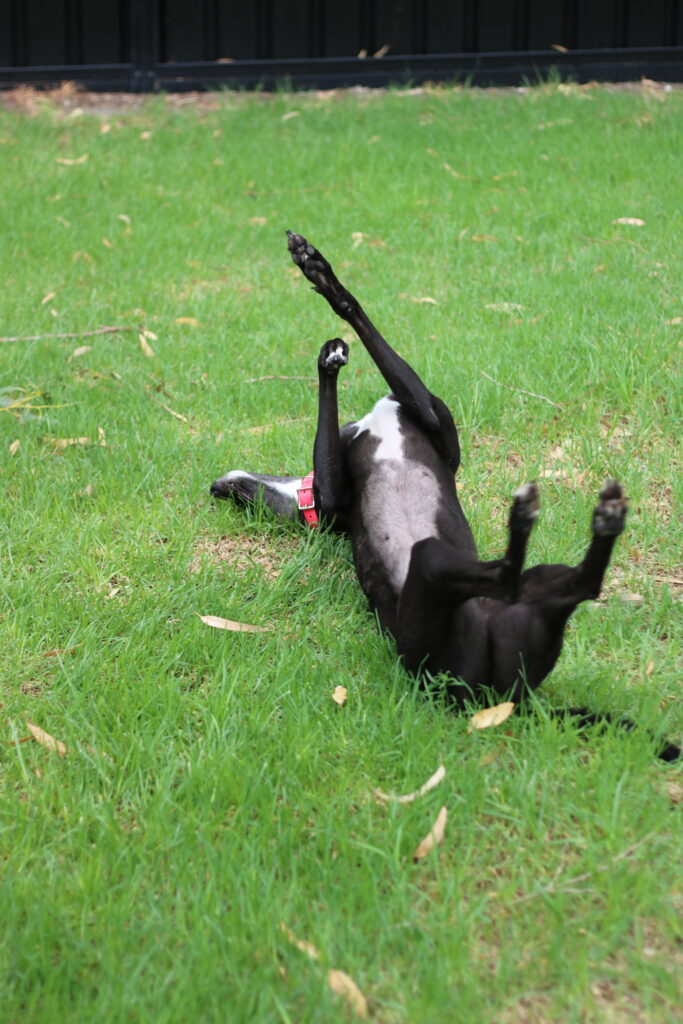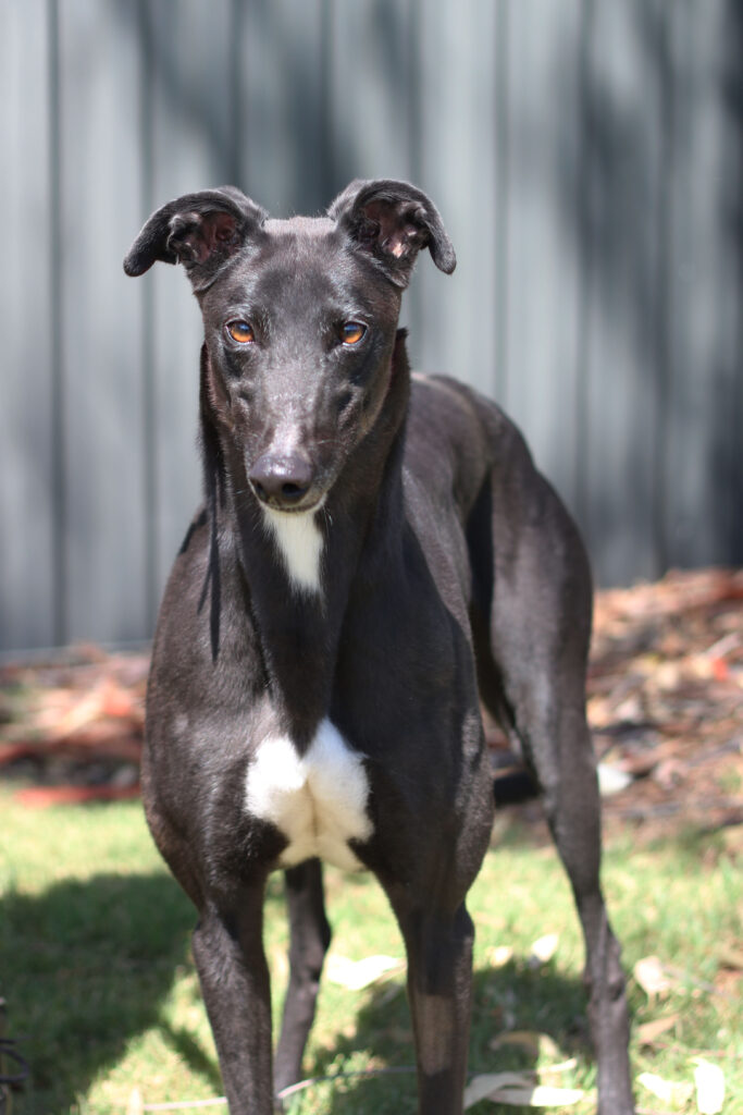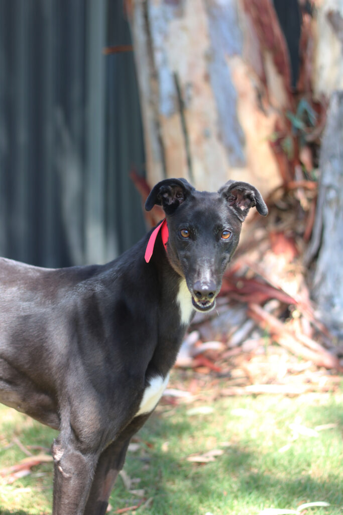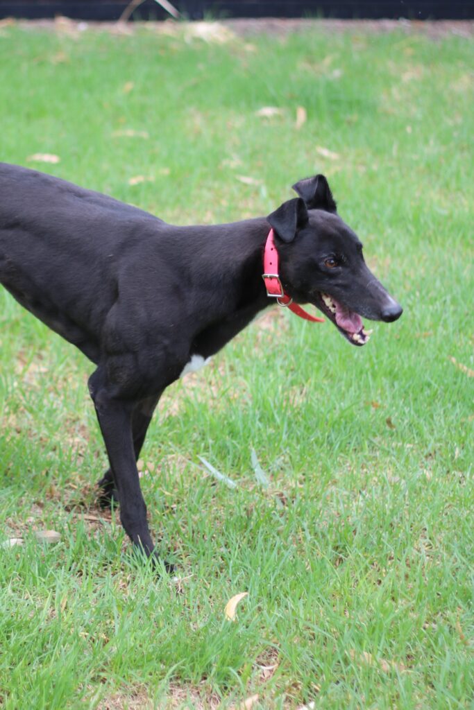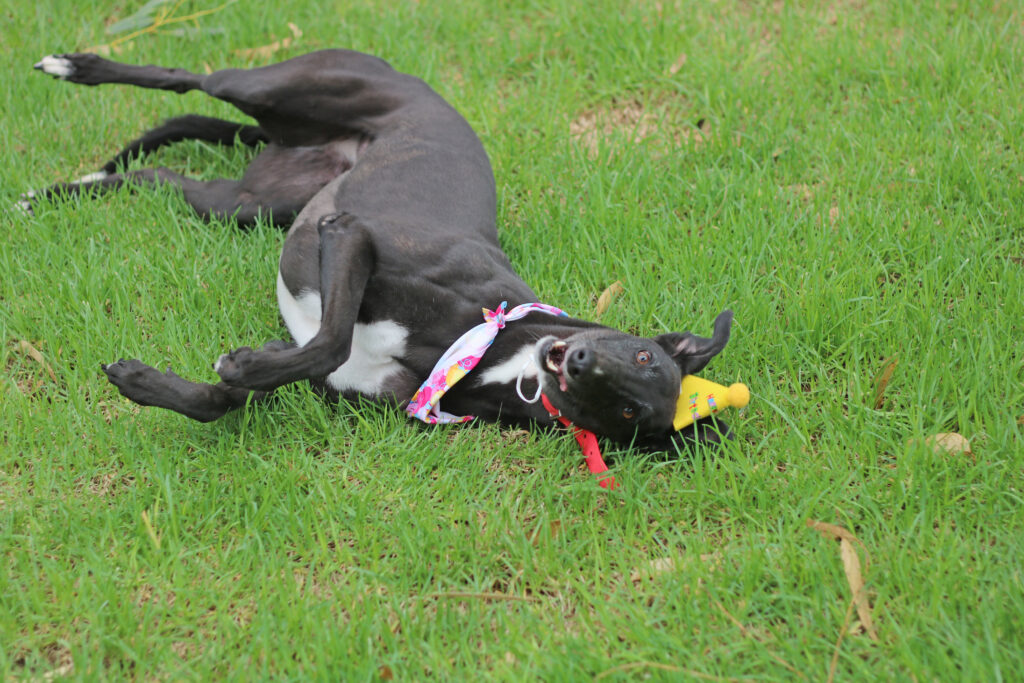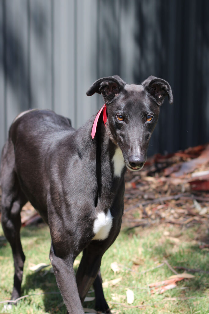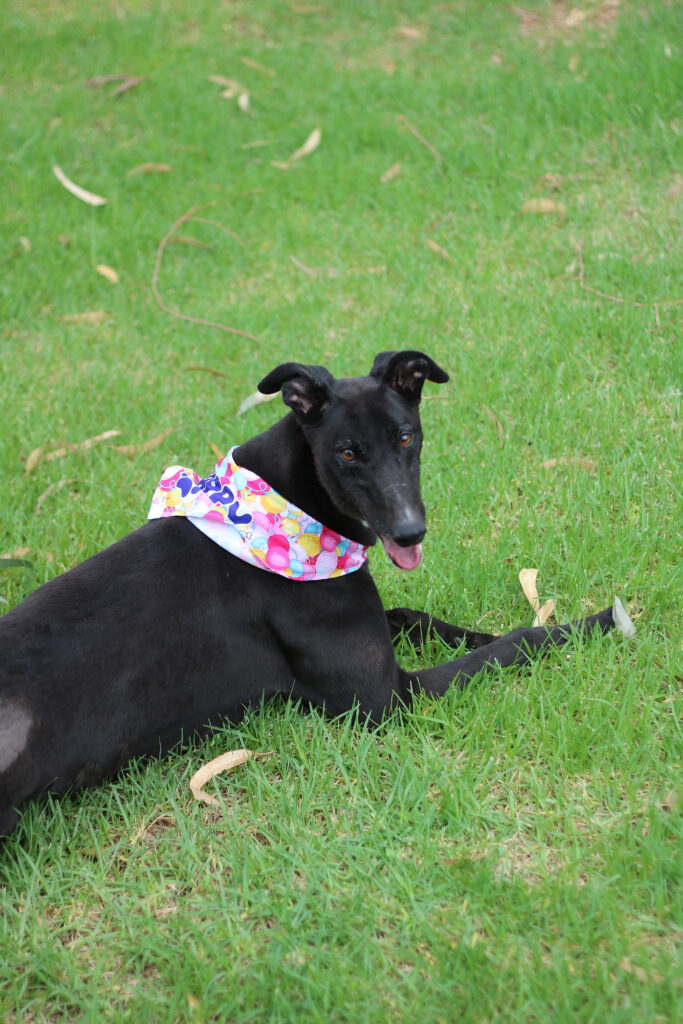 Miss Muffet is a sweet gentle soul who needs a little time to uncurl from her “tuffet” and reveal the affectionate friendly girl she is. Miss Muffet would do well with a fellow greyhound who can show her the ropes of pet life and her new home. Miss Muffet has been assessed as unable to go to a home with cats. Miss Muffet would do best in a home where all humans are nine years or older, with people who understand she may need a moment to bloom into her playful self, She can stay home alone for up to three hours. With canine company and routine she may be able to extend that time as she settles in. Exercise needs are typical greyhound, one or two 20‑minute walks a day for her explore the world, sniffing and taking everything in. Miss Muffet has Pannus, an eye condition which is easily treated with daily eye drops and does not affect their quality of life.