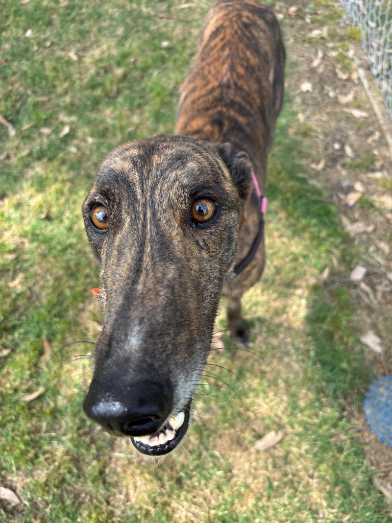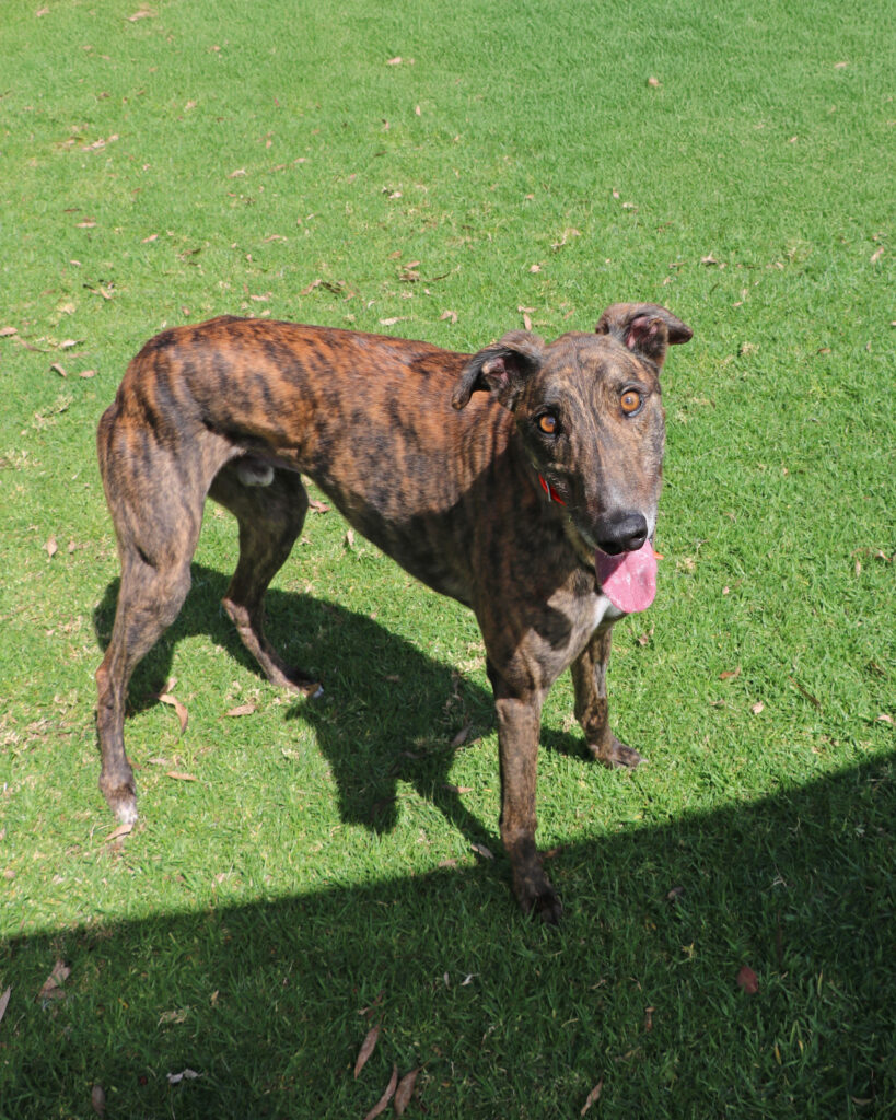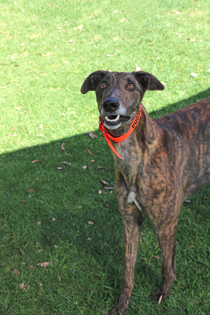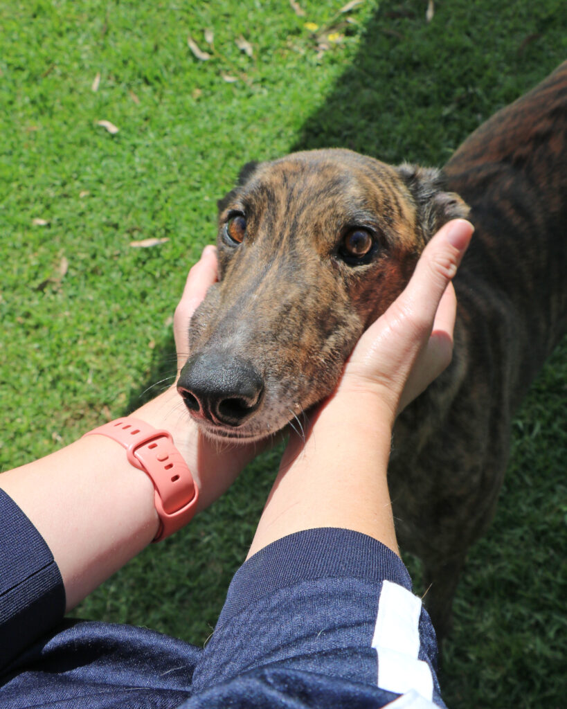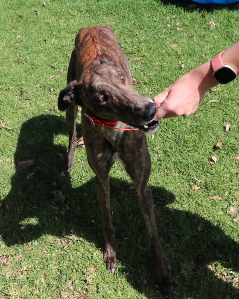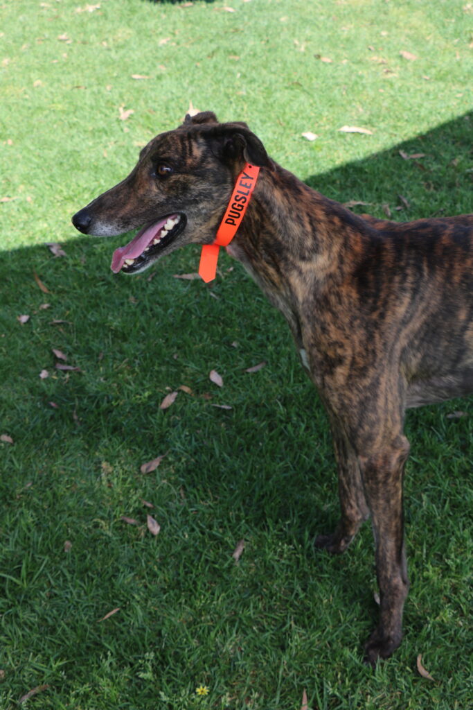 Pugsley is a slightly cheeky people-loving hounds who believes in good leans, happy tail wags and showing you in plenty of affection. Whether you’re dishing out pats, going on walkies or just doing chores nearby, Pugsley will make sure you know you’re loved. Pugsley could share his home with doggie friends of any size from small pups to fellow greyhounds as long as they will enjoy a friendly companion. Pugsley has been assessed as unable to go to a home with cats. Pugsley would do best with children nine years or older as his playful enthusiasm might be a bit much for smaller tots. He’s still learning how to stay home alone but with gentle guidance and a doggy friend for company Pugsley will find his groove. Like a true greyhound his exercise needs are simple, one or two 20 minute walks and a bit of playtime a day will keep his tail wagging. Toys don’t hold much interest for him, but his love language is definitely food! Give him some treats and you will have a doting best friend for life.