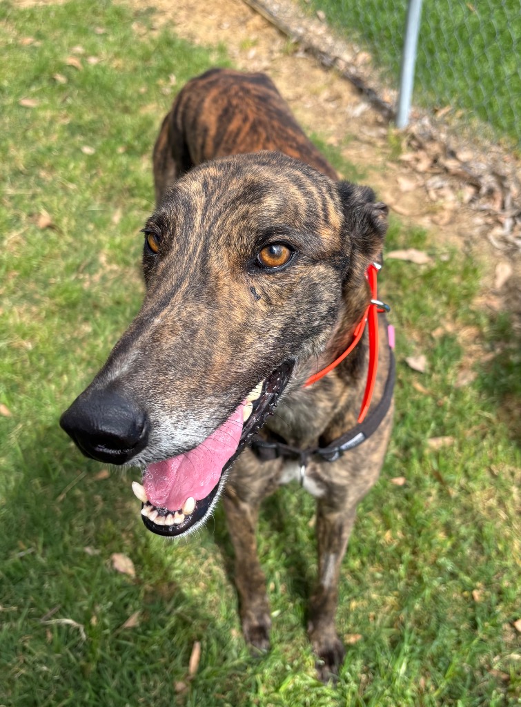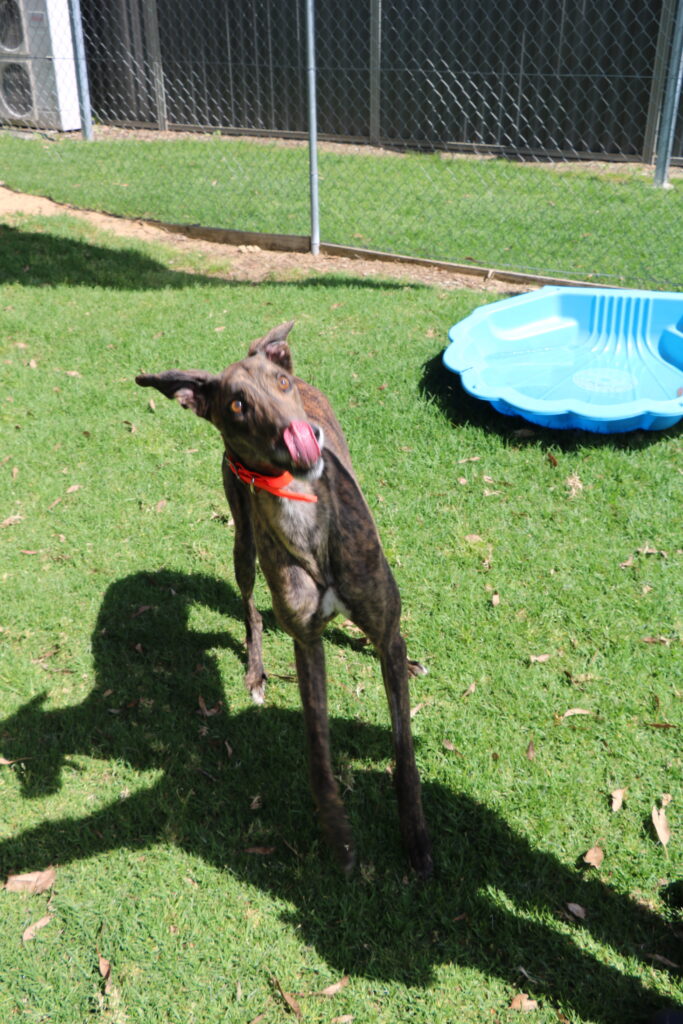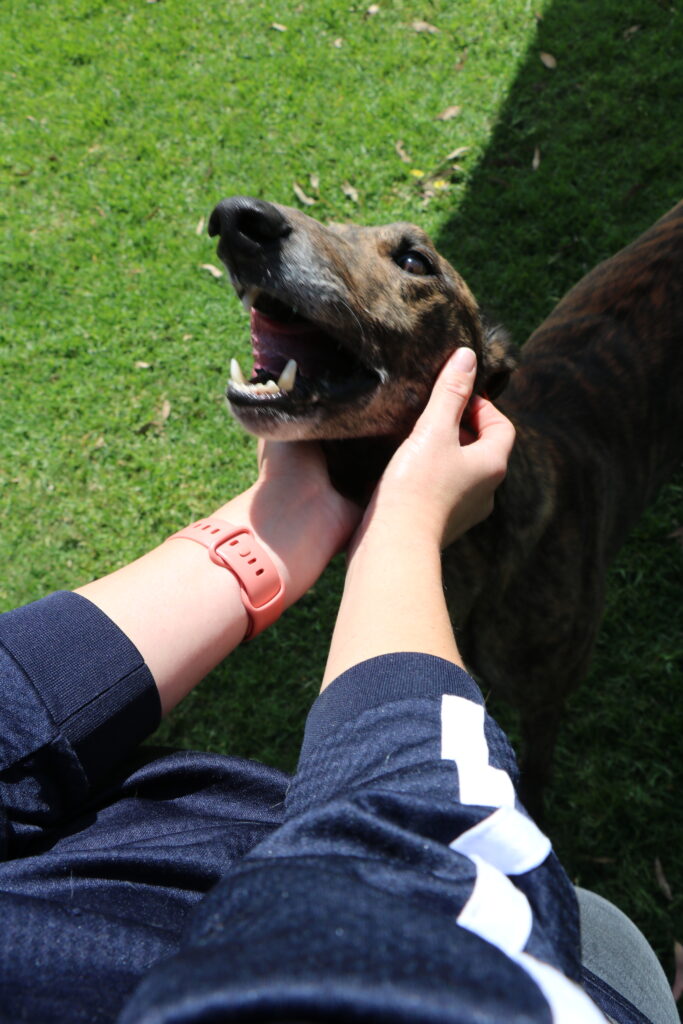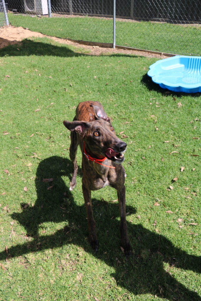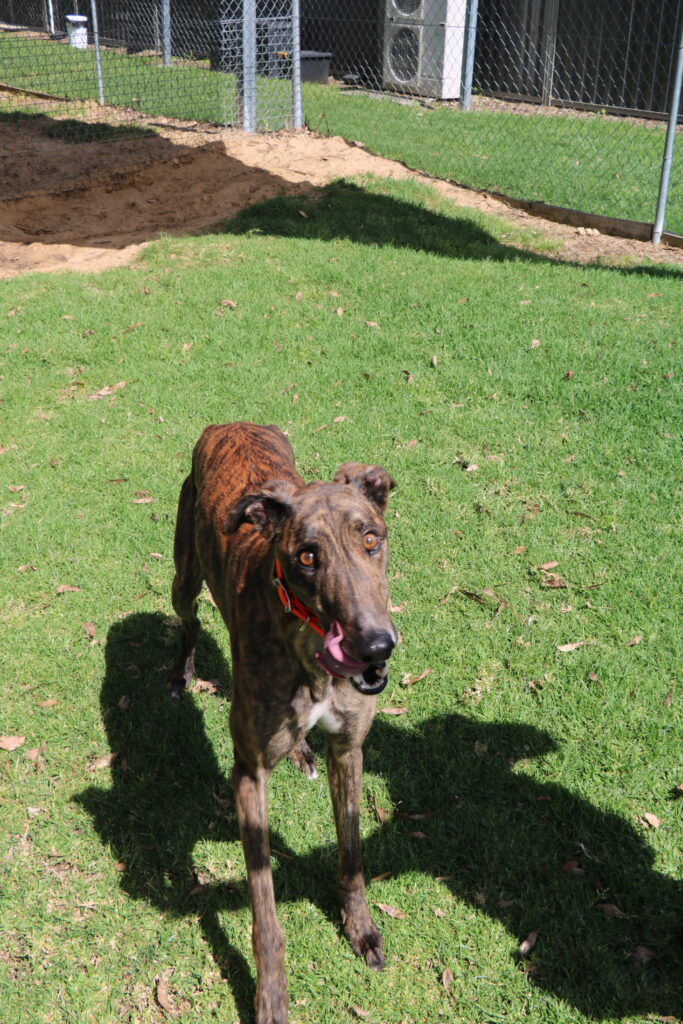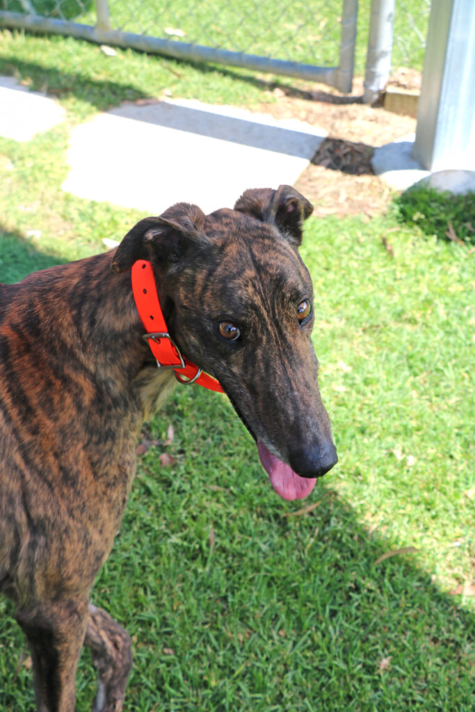 Pugsley is a slightly cheeky people-loving hounds who believes in good leans, happy tail wags and showing you in plenty of affection. Whether you’re dishing out pats, going on walkies or just doing chores nearby, Pugsley will make sure you know you’re loved. Pugsley could share his home with doggie friends of any size from small pups to fellow greyhounds as long as they will enjoy a friendly companion. Pugsley has been assessed as unable to go to a home with cats. Pugsley would do best with children nine years or older as his playful enthusiasm might be a bit much for smaller tots. He’s still learning how to stay home alone but with gentle guidance and a doggy friend for company Pugsley will find his groove. Like a true greyhound his exercise needs are simple, one or two 20 minute walks and a bit of playtime a day will keep his tail wagging. Toys don’t hold much interest for him, but his love language is definitely food! Give him some treats and you will have a doting best friend for life.